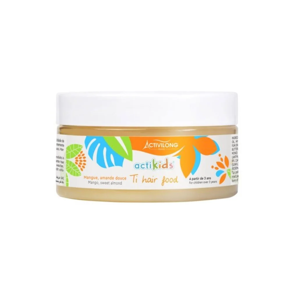 Le baume « Ti hair food » d’ACTIKIDS est un produit polyvalent conçu pour sceller l’hydratation et laisser les cheveux doux et soyeux. Enrichi en beurre de mangue et en huile d’amande douce bio, ce baume offre une hydratation profonde tout en nourrissant et en protégeant les cheveux.