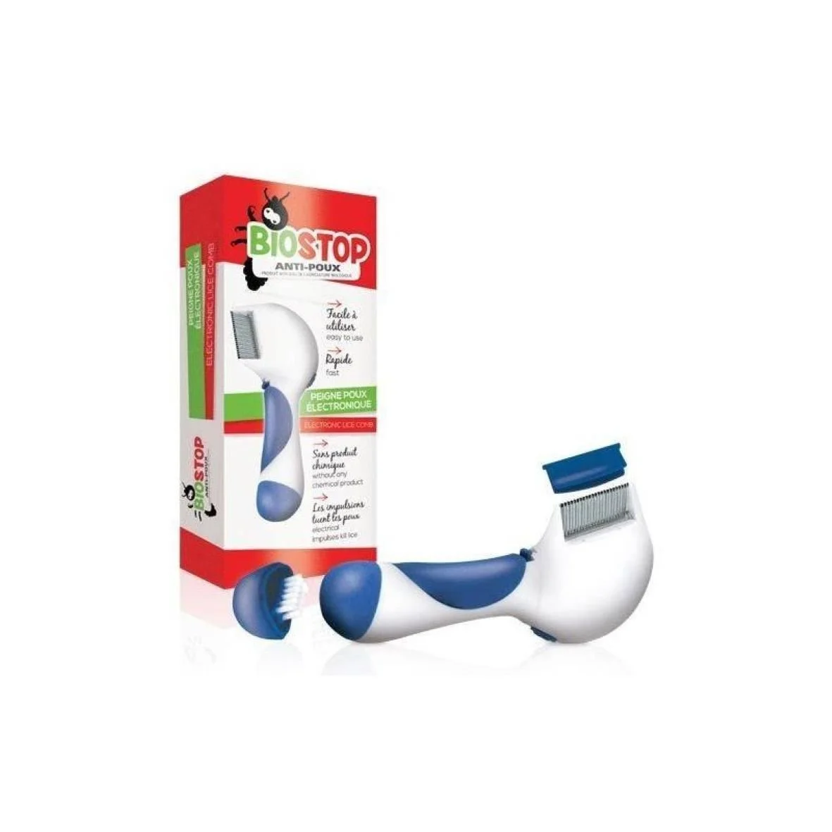 Le secret de BIOSTOP réside dans sa technologie d’impulsion électrique. Dès que les dents du peigne entrent en contact avec un pou ou une lente, une décharge électrique instantanée les élimine. Simple, efficace et sans danger !