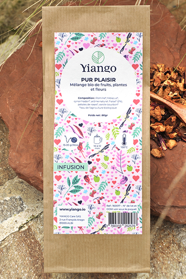 Pomme*, hibiscus*, cynorrhodon*, arôme naturel, fraise* (2%), pétale de rose*, vanille bourbon*