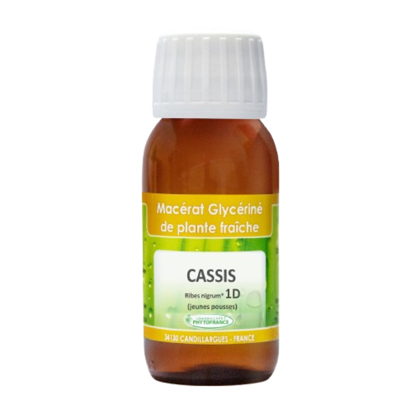 Le macérat glycériné de cassis est une préparation formulée par le laboratoire Phytofrance qui consiste à macérer des bourgeons de cassis dans un mélange d’eau, de glycérine et d’alcool. Cette méthode a pour but d’extraire les principes actifs de la plante afin de préserver l’action hyperactive des bourgeons tout en garantissant une utilisation simple et pratique.