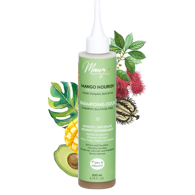- Nourrissant : Grâce à des ingrédients comme le beurre de mangue, les huiles d’avocat et de karapate, ce shampoing nourrit et hydrate vos cheveux en profondeur. Il les rend plus souples, plus doux et plus faciles à coiffer.