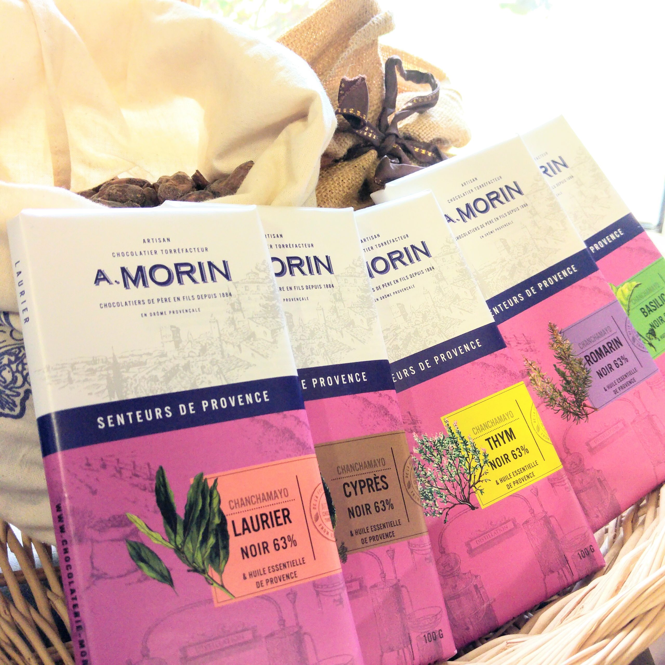 L’idée de la création des tablettes aux huiles essentielles est venue de notre situation géographique. En effet, la chocolaterie est en pleine campagne, avec un champ de lavande à côté. Lors de la récolte du champ, une brise d’air apporta une odeur de lavande jusque dans les locaux. Nous nous sommes rendus compte que cela avait un impact sur la perception gustative du chocolat. En discutant avec notre voisin de ce phénomène nous avons eu l’idée de créer des tablettes aux huiles essentielles. Avec le temps, cette nouvelle gamme est finalement née d’une association locale entre le savoir faire de La Baume des Anges et celui de La Chocolaterie Morin. Cette gamme de tablette est composée de chocolat aux huiles essentielles de Thym, Romarin, Cyprès, Basilic et Laurier. Ces plantes typique de notre région sont cultivées sur place et travaillées localement. Le choix a été fait d’avoir un gout franc des différentes huiles essentielles.