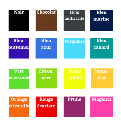 6 à 9g /100 g de tissu = 613 Prune ; 629 Vert émeraude ; 624 Turquoise ; 631 Bleu canard ; 621 Bleu Azur ; 623 Bleu Outremer ; 637 Gris anthracite