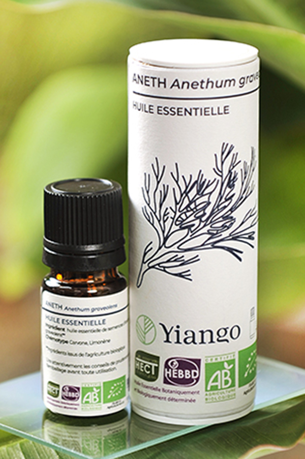 Sur la peau : Mélangez 35 gouttes d’ huile essentielle d’aneth bio avec 10 gouttes d’huile végétale d’amande douce bio, en cas de règles douloureuses, massez en douceur le bas de ventre 2 fois par jour.